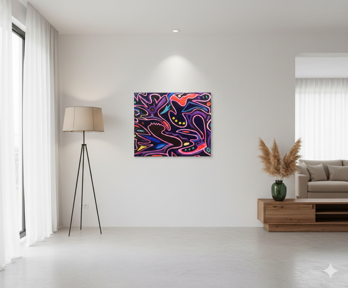 Cosmogonica is a work with a dark background, motifs drawn with pink lines and few colors in its composition.
