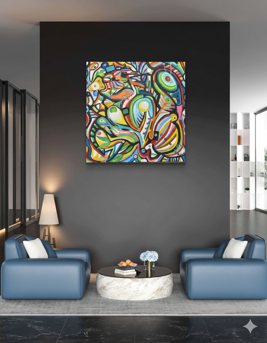 An abstract piece full of kinetic energy and vibrant organic forms. The composition is a dynamic tangle of thick black lines that enclose a palette of intense colors, creating a sense of movement and life.