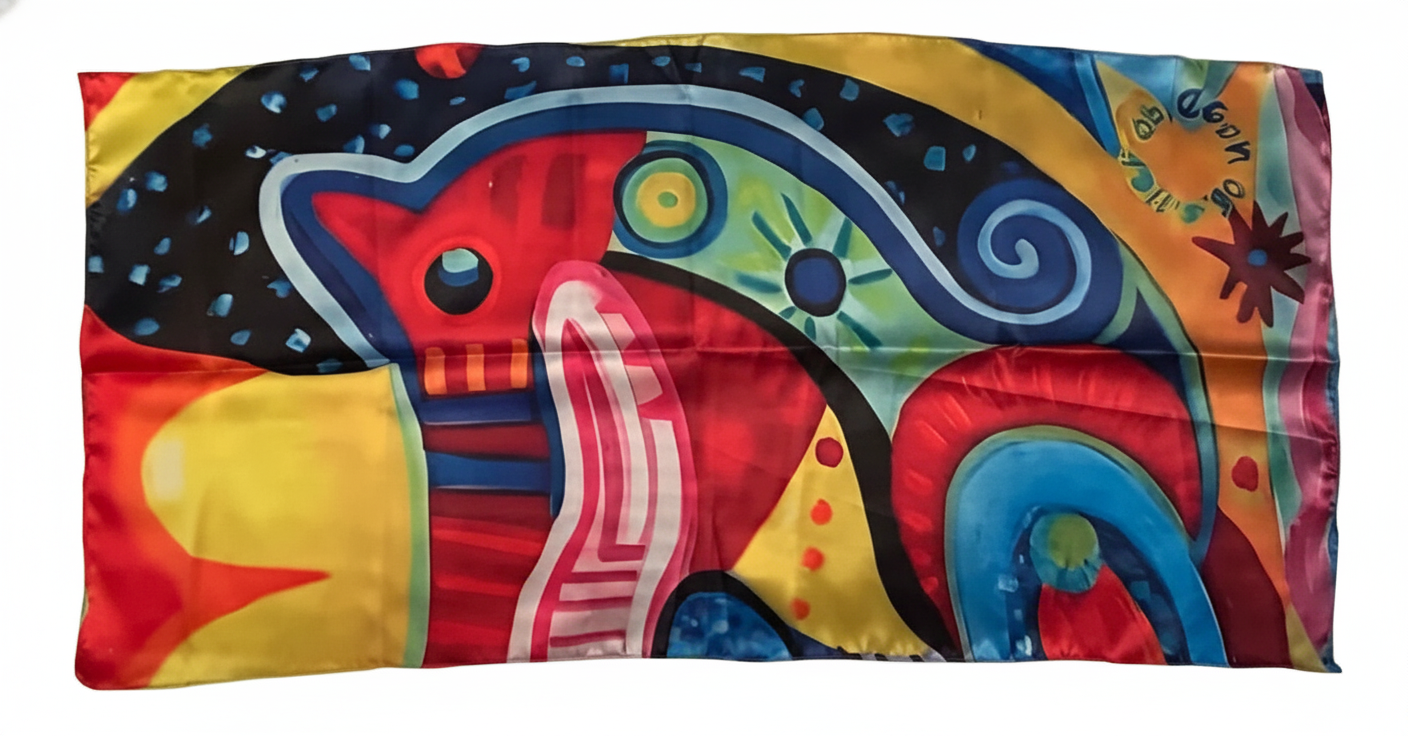 Emportez l'art partout avec vous grâce à cette écharpe de créateur exclusive, une pièce qui fusionne haute couture et expression artistique. Cette œuvre textile est une reproduction fidèle par sublimation d'une pièce originale du célèbre artiste Mauricio Siller Obregón.