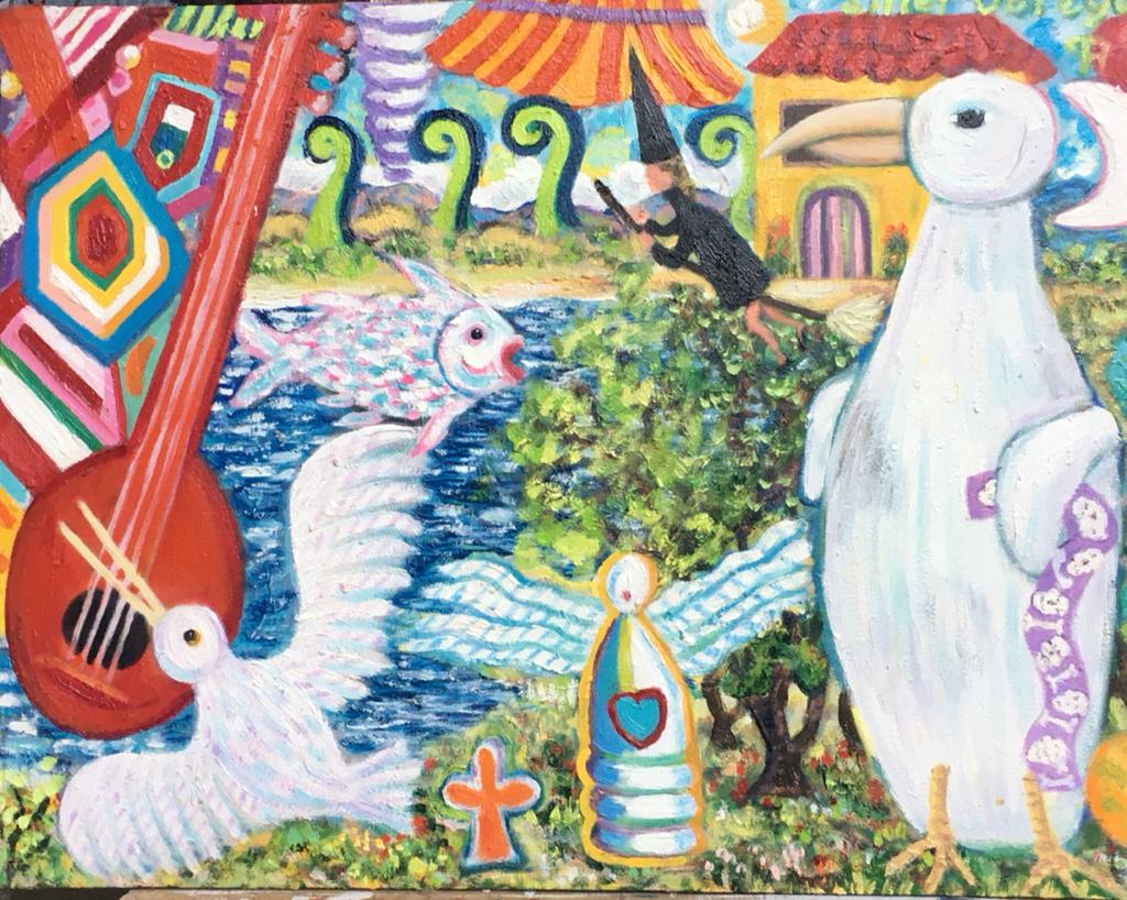 Un pingüino del hemisferio sur, un pez que vuela al igual que una brujita en su escoba y una ave marina, entre otros elementos fantásticos pintados en este óleo.