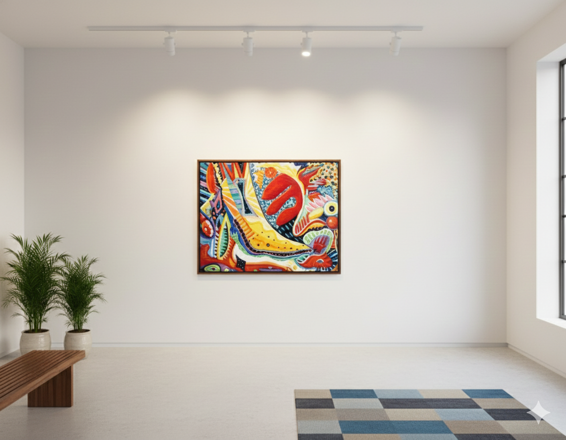 Formaciónes y sorpresas coloridas se amontonan y se separan en un juego rítmico pictórico, que se muestra en un espacio exterior.
