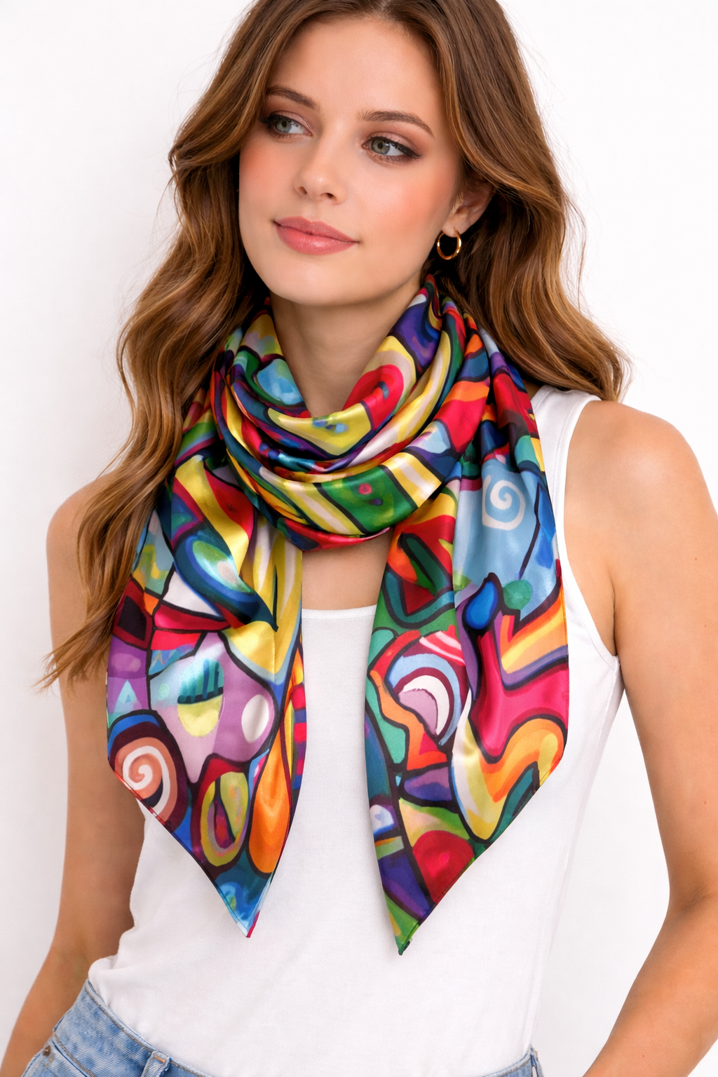 Confeccionada en tela satín de textura etérea y ligera, la pieza destaca por sus colores vibrantes y su caída elegante. Con dimensiones de 100×50 cm, es un accesorio versátil que funciona tanto como una prenda de lujo como una pieza de colección para los amantes del arte contemporáneo.
