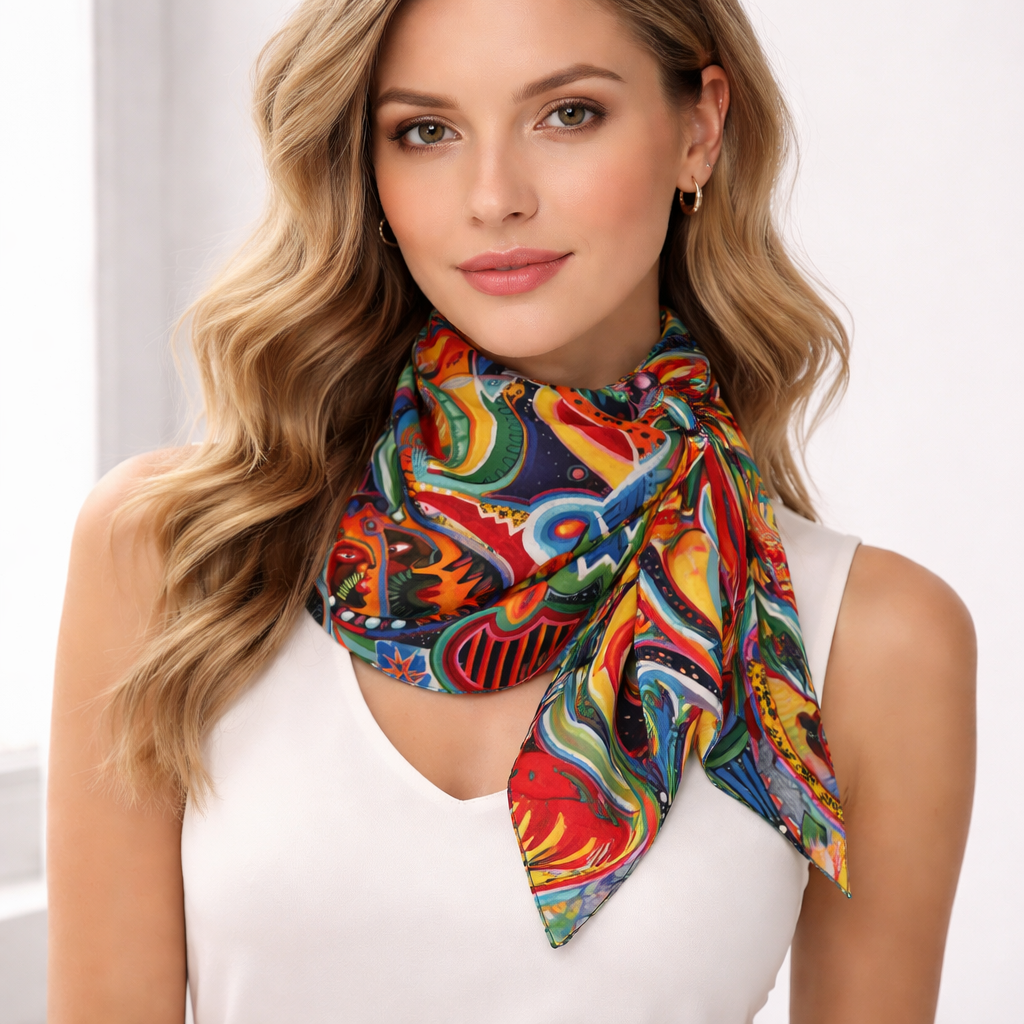 Confeccionada en tela shifón de textura etérea y ligera, la pieza destaca por sus colores vibrantes y su caída elegante. Con dimensiones de 100×50 cm, es un accesorio versátil que funciona tanto como una prenda de lujo como una pieza de colección para los amantes del arte contemporáneo.