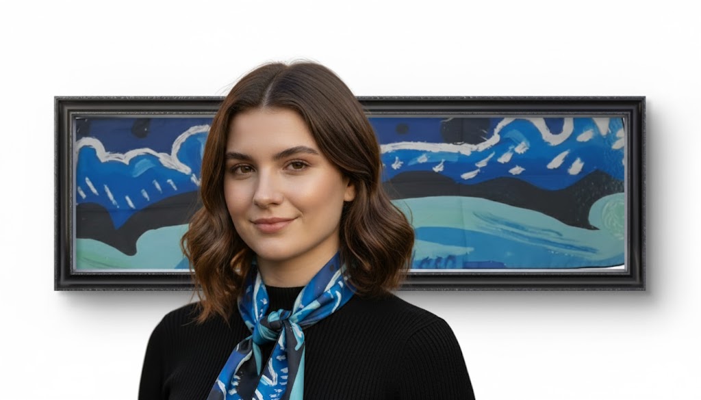 La pañoleta “Tarde Azul” está inspirada en la obra del artista Mauricio Siller Obregón, una pintura que evoca calma, introspección y la serenidad del color azul en sus diferentes matices.