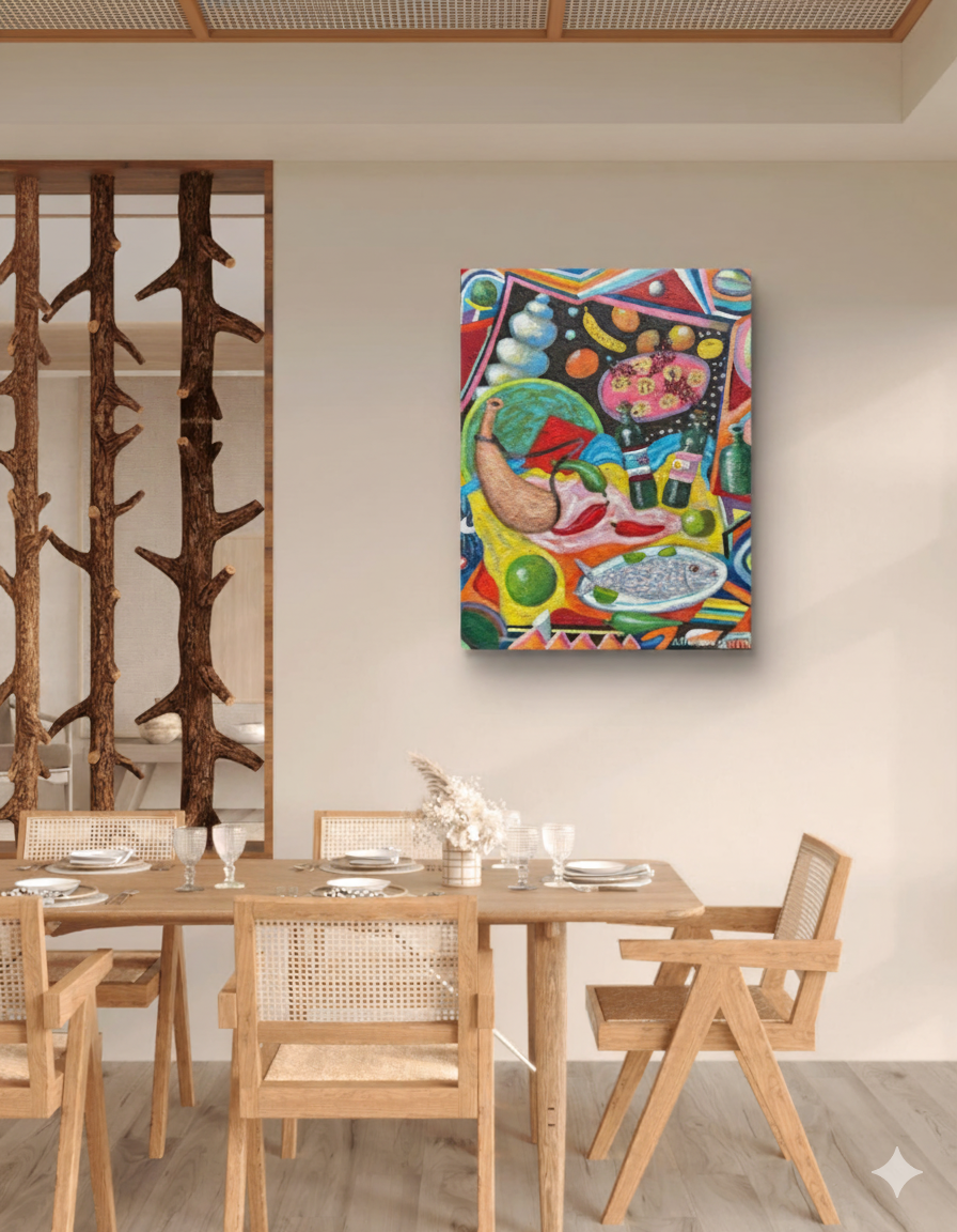 Una explosión de color y textura, celebrando la riqueza de la cocina y la cultura. Este vibrante bodegón fusiona elementos tradicionales y un estilo pop-art único.
